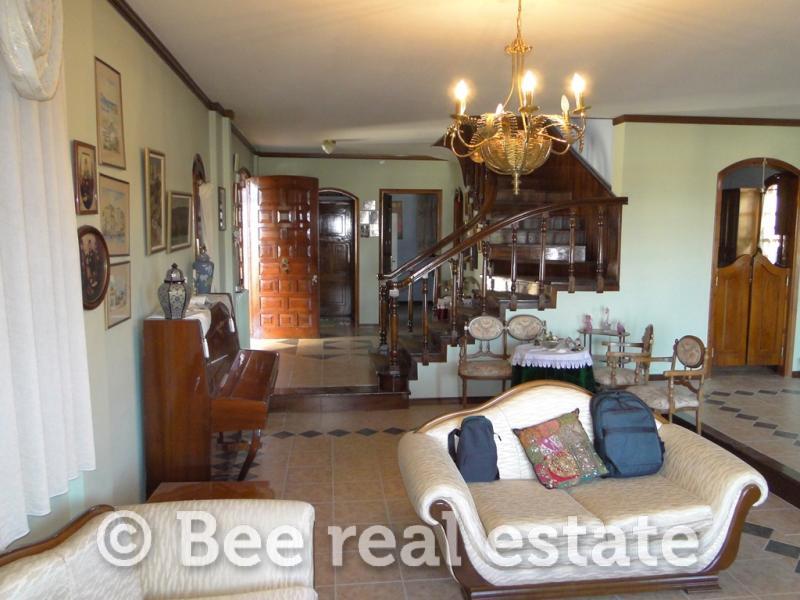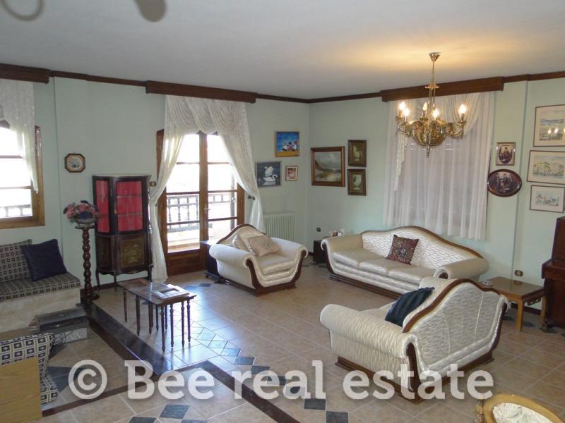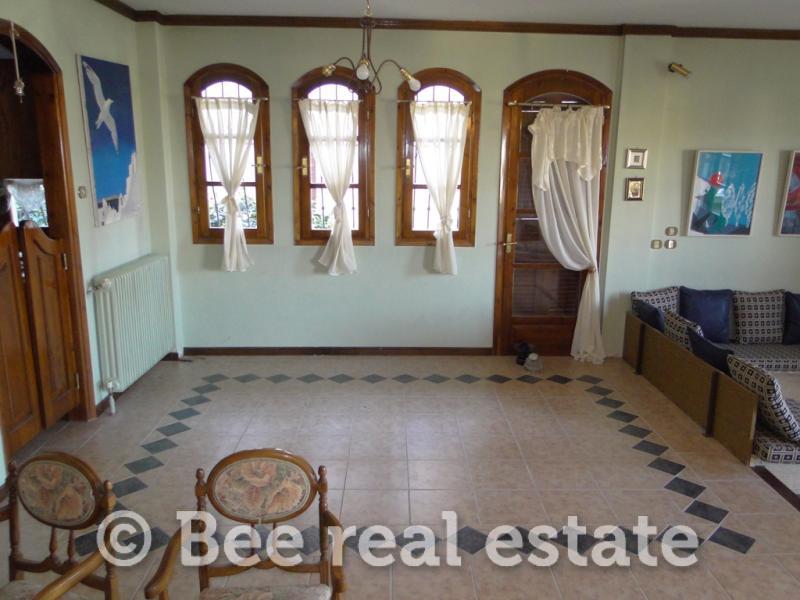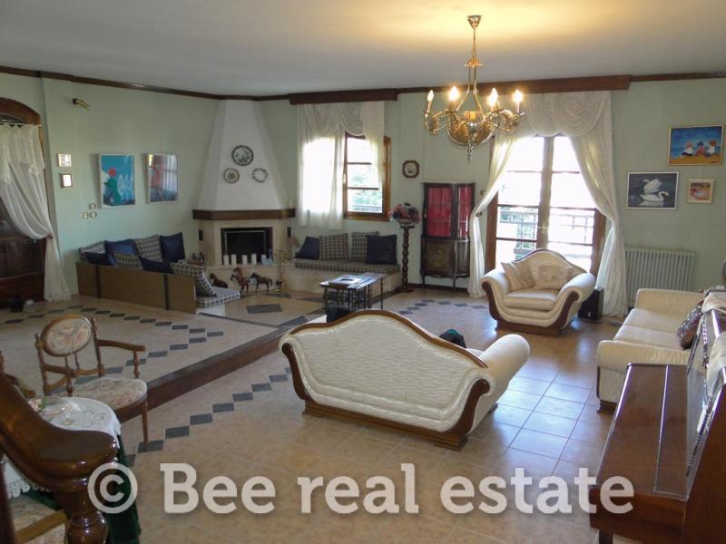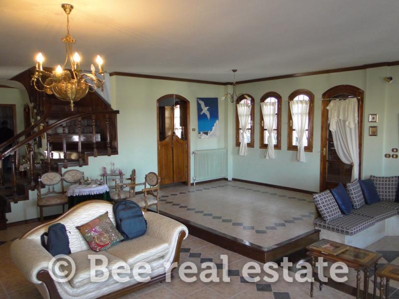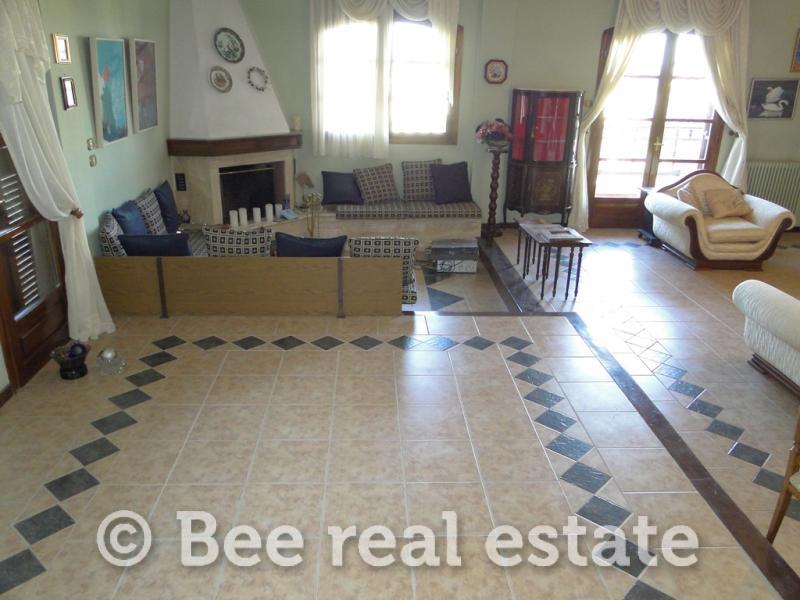 Μπαίνοντας στην κατοικία στο πρώτο επίπεδο – πρώτο όροφο, συναντάμε ένα χώρο υποδοχής και εισερχόμαστε στο φωτεινό σαλόνι με το ενεργειακό τζάκι και το μεγάλο μπαλκόνι με ωραία θέα. Πρόκειται για μεγάλο χώρο όπου εύκολα μπορεί να υποδεχθεί δύο σαλόνια. Στον ίδιο χώρο βρίσκεται και η επίσημη τραπεζαρία που είναι διαχωρισμένη διακριτικά.