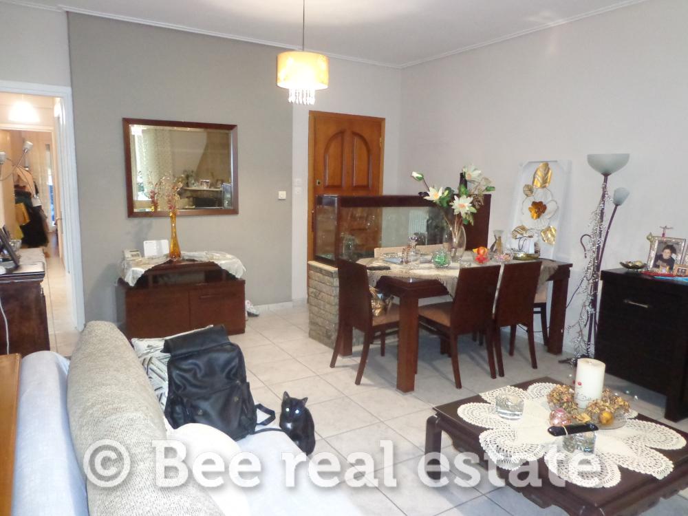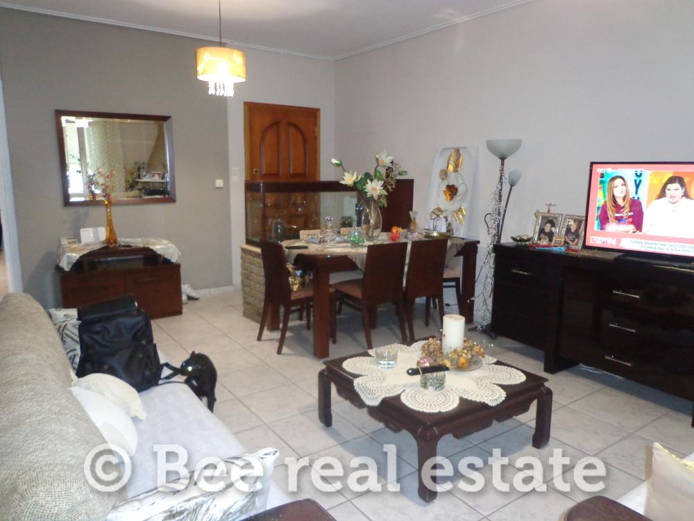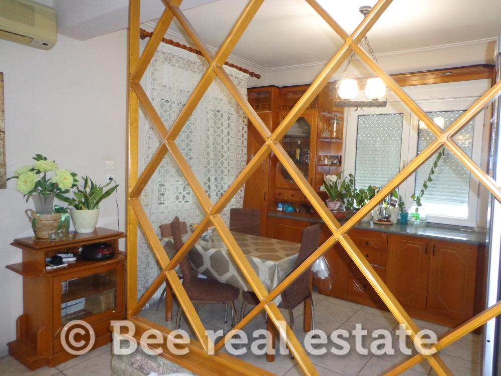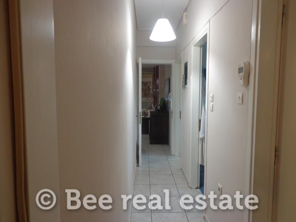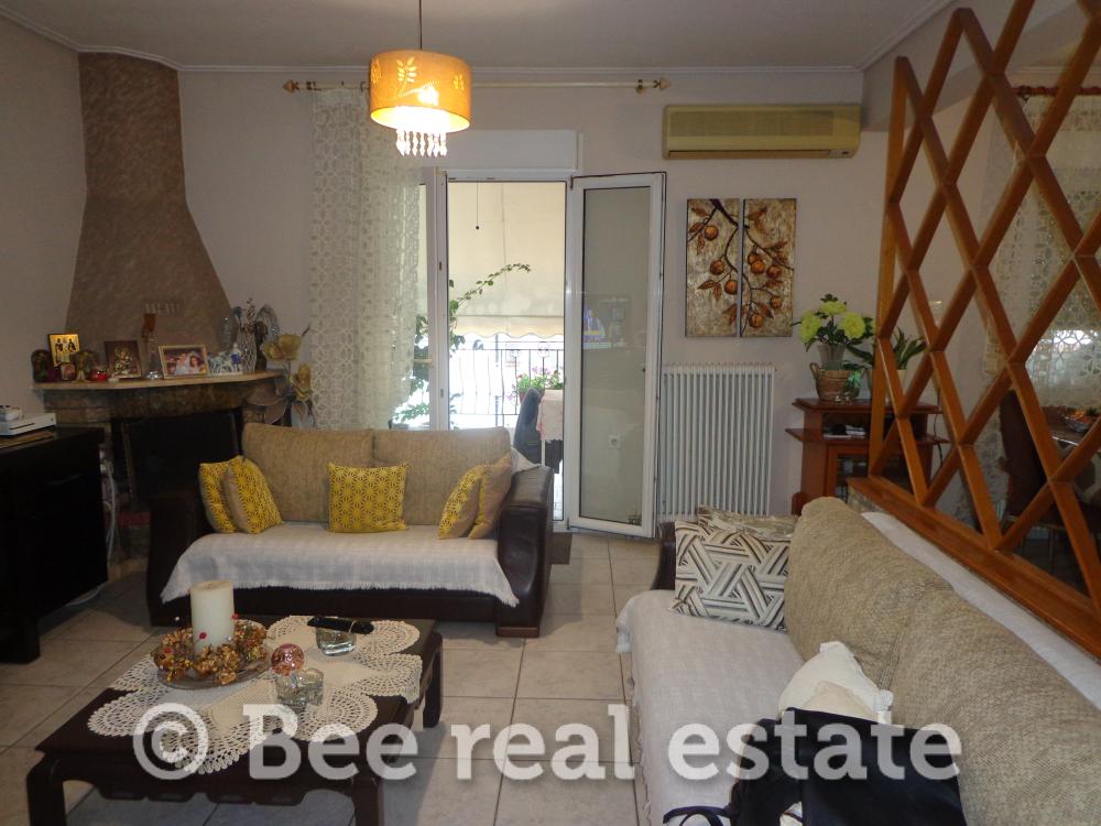 Αποτελείται από τον ενιαίο χώρο του καθιστικού με το γωνιακό τζάκι και την τραπεζαρία που βλέπουν στη μεγάλη μπροστινή βεράντα του διαμερίσματος, από την ημι-ξεχωριστή, ευρύχωρη κουζίνα όπου χωράει τραπέζι φαγητού, από τα τρία υπνοδωμάτια με ντουλάπες και μπαλκονόπορτες που μας βγάζουν στην πίσω βεράντα, από το κυρίως μπάνιο με παράθυρο για φυσικό φωτισμό και εξαερισμό και το w.c. Θερμαίνεται με ατομικό λέβητα Φ/Α και δροσίζεται με κλιματιστικό στο χώρο του καθιστικού. Συνοδεύεται από αποθήκη υπογείου 10τμ.