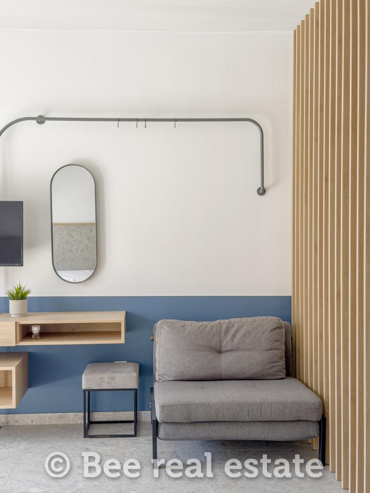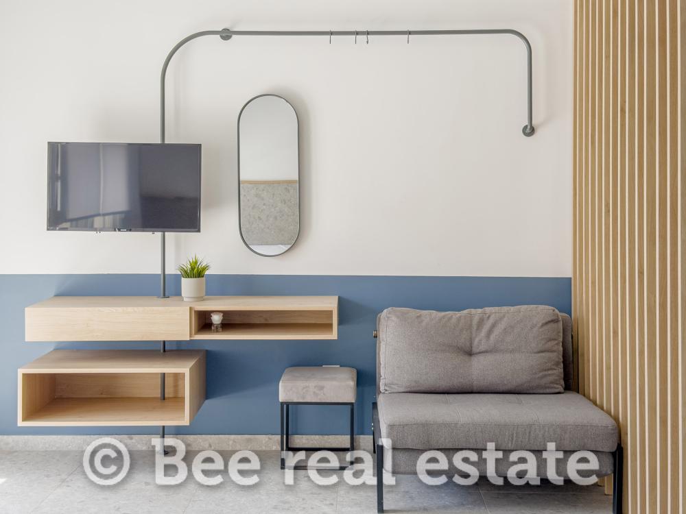 Sie wird vollständig möbliert und ausgestattet verkauft und ist sofort bezugsbereit. Zur Ausstattung gehören eine Daikin-Klimaanlage, ein 32-Zoll-Fernseher, Kühlschrank, Kochfelder mit Dunstabzugshaube, Nespresso-Maschine, Safe sowie Balkonmöbel. Die Raumaufteilung umfasst ein Doppelbett (160 cm), ein Einzelbett (80 cm) und ein Schlafsofa.