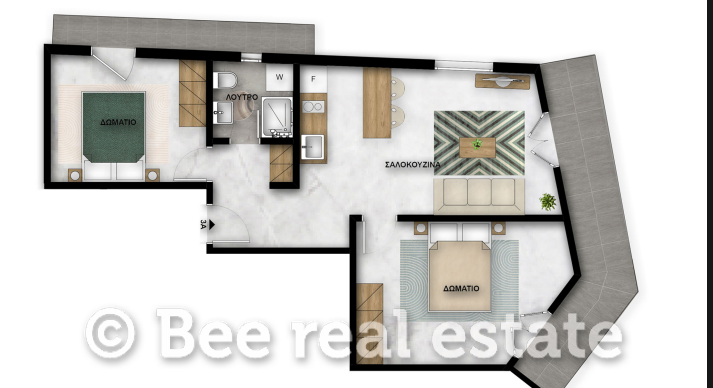 Το διαμέρισμα αποτελείται από άνετη σαλοκουζίνα, δύο ευρύχωρα υπνοδωμάτια, μεγάλο λουτρό και λειτουργικό χώρο εισόδου (χωλ). Όλοι οι χώροι έχουν άμεση πρόσβαση σε μεγάλα μπαλκόνια, τα οποία προσφέρουν άνεση και άπλετο φυσικό φως.