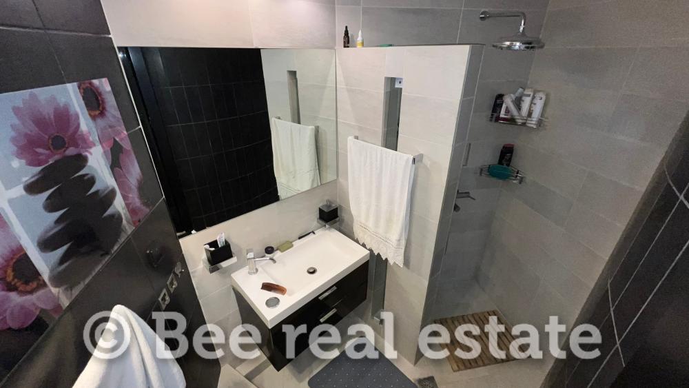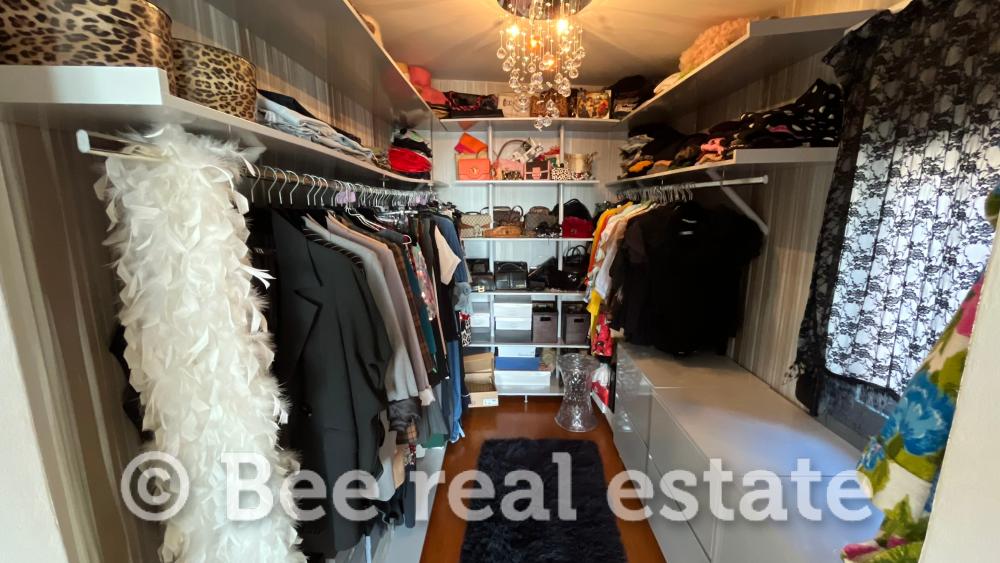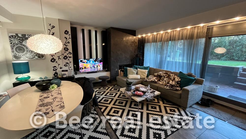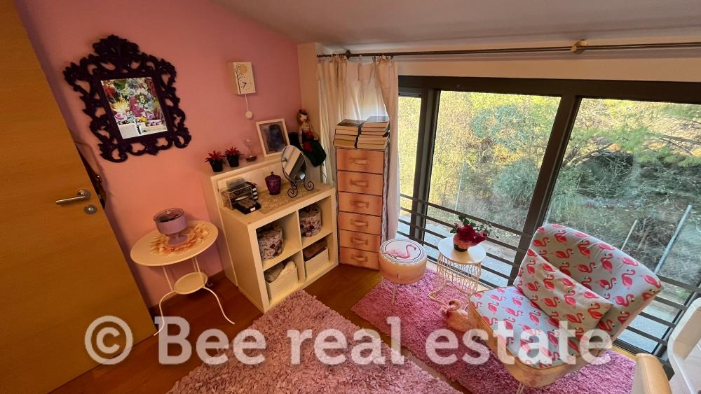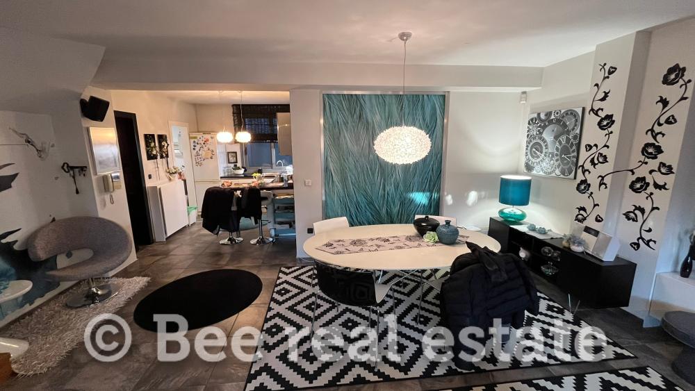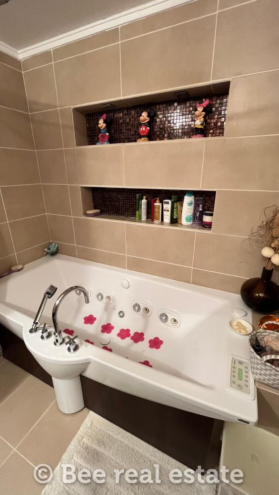 On the mezzanine - ground floor we find a large and bright living room with a fireplace with a large balcony door with direct access to the fantastic garden, a kitchen with all electrical appliances, a room with a laundry area, two bedrooms, a bathroom, a cloakroom area with a jacuzzi and the boiler room area.